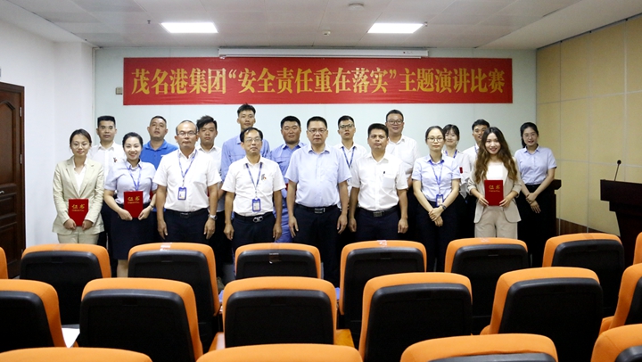 楊超燦對本次“安全責(zé)任重在落實(shí)”演講比賽給予充分肯定。他表示,本次比賽參與面廣,吸引了集團(tuán)辦公室、財(cái)務(wù)部、投資發(fā)展部、工程管理部以及各下屬企業(yè)的的選手參加,擴(kuò)大了安全宣講的影響力,充分體現(xiàn)了“安全工作人人有責(zé)”;各位選手演講時(shí)神抖擻,內(nèi)容切合工作實(shí)際,言之有物,充分展現(xiàn)了茂名港人昂揚(yáng)向上的良好精神風(fēng)貌。他強(qiáng)調(diào),今年是集團(tuán)重點(diǎn)項(xiàng)目建設(shè)的關(guān)鍵之年,我們要堅(jiān)定信心,認(rèn)真學(xué)習(xí)本次演講主題“安全責(zé)任重在落實(shí)”的內(nèi)涵,把安全責(zé)任落實(shí)到每個(gè)環(huán)節(jié)、每個(gè)崗位、每個(gè)人,做到“守土有責(zé)、守土負(fù)責(zé)、守土盡責(zé)”,助力集團(tuán)生產(chǎn)運(yùn)營、項(xiàng)目建設(shè)、疫情防控等各項(xiàng)工作取得成效,夯實(shí)本質(zhì)安全基礎(chǔ),推動(dòng)集團(tuán)安全生產(chǎn)形勢持續(xù)穩(wěn)定向好。 評委們與參賽選手們合影 ↓↓