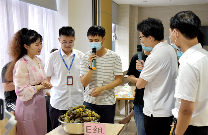 包粽子比賽通過人員交叉搭配進行分組比賽。在嫻熟的“老手”作現(xiàn)場示范講解后,各組隊員紛紛動手上陣。只見組員之間分工合作、相互配合,折粽葉、裝糯米、放餡料、裹扎繩……大家紛紛拿出自己的“拿手絕活”。30分鐘的比賽里洋溢著歡聲笑語,各位選手巧手翻飛,一個個形態(tài)各異的粽子瞬間成型。最后,大會裁判以“速度、質(zhì)量、美觀、衛(wèi)生”為評判標準對各組粽子進行了評選。