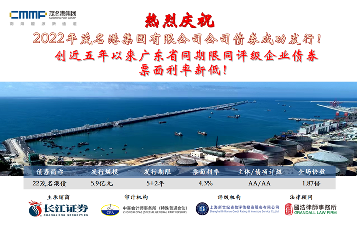 9月15日,2022年茂名港集團有限公司公司債券成功發(fā)行,發(fā)行規(guī)模5.9億元,期限為5+2年,票面年利率4.3%,全場認購倍數(shù)為1.87倍。本期債券創(chuàng)下票面利率新突破:創(chuàng)近五年以來全國同期限同評級企業(yè)債券第三低、廣東省同期限同評級企業(yè)債券票面利率新低! 在兩小時的簿記中,茂名港集團公司債券得到多家金融機構爭先認購,使得本期公司債券利率一路走低,由4.8%降至4.3%,最終簿記當天參與投標的投資機構超過20家,投標認購資金高達11.06億元。其中,14家投資機構中標,發(fā)行票面利率為4.3%,為集團節(jié)省了2095.32萬元財務成本。
