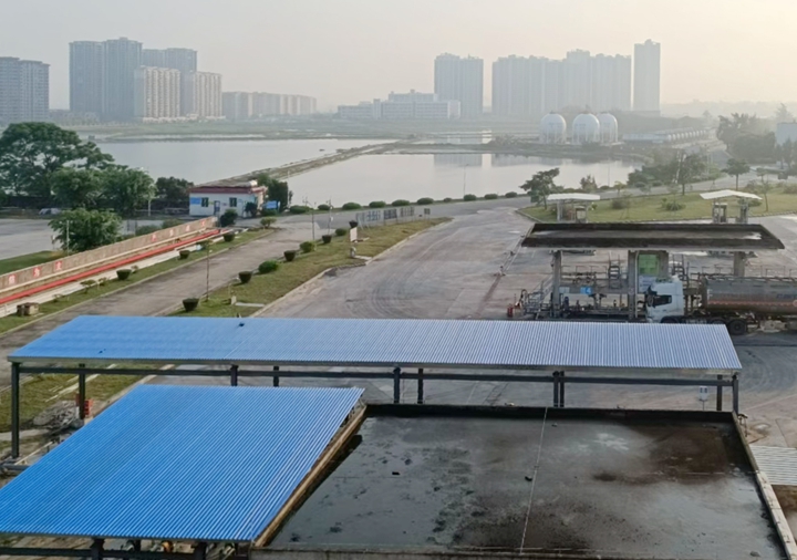 據(jù)悉,2#油庫卸車臺露天雨棚的搭建,旨在保護卸車作業(yè)免受惡劣天氣影響,確保油品在裝卸過程中的質量與安全。雨棚的建成不僅為作業(yè)人員提供了良好的工作環(huán)境,也有效減少了雨水對油品質量的影響和對生產設備的潛在損耗;同時兼顧美觀性,使之成為庫區(qū)一道亮麗的風景線。