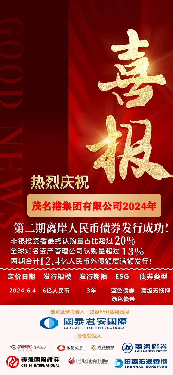 6月4日,茂名港集團(tuán)有限公司成功定價(jià)2024年第二期境外人民幣債券,在港交所、澳交所掛牌,發(fā)行規(guī)模6億人民幣,茂名港集團(tuán)兩期共12.4億人民幣境外債額度圓滿發(fā)行成功。兩期債券獲得綠色債券和藍(lán)色債券雙重認(rèn)證,作為全國首筆“藍(lán)標(biāo)+綠標(biāo)”境外債券,為茂名市清潔能源、綠色交通、可持續(xù)發(fā)展的新質(zhì)生產(chǎn)力等重要領(lǐng)域提供了資金支持。