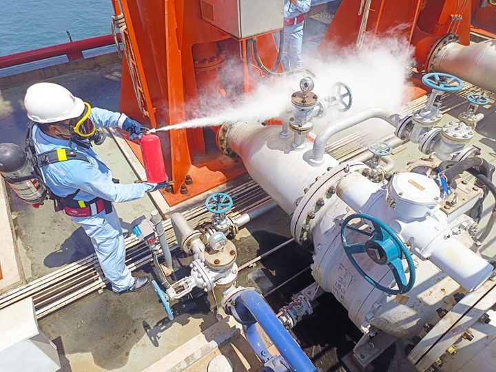 演練現(xiàn)場(chǎng),警報(bào)聲響起,人員、車(chē)輛迅速集結(jié)到位。按照搶險(xiǎn)救災(zāi)組、疏散警戒組、通訊聯(lián)絡(luò)組、后勤保障組、醫(yī)療救護(hù)組、后勤醫(yī)療組等五個(gè)工作組的分工要求,參演人員各就各位、各司其責(zé)。他們有的迅速疏散無(wú)關(guān)人員完成現(xiàn)場(chǎng)警戒;有的迅速向市公司指揮中心及相關(guān)部門(mén)報(bào)告情況;有的迅速使用消防水泵泡沫泵、干粉滅火器撲滅初期火災(zāi),并對(duì)泊位E2裝卸區(qū)進(jìn)行全面冷卻;有的迅速開(kāi)展醫(yī)療及后勤等方面的應(yīng)急處理。各參演小組反應(yīng)快速、緊密配合、協(xié)同作戰(zhàn),現(xiàn)場(chǎng)警戒、人員疏散、滅火救援、后勤保障等各項(xiàng)應(yīng)急動(dòng)作有序進(jìn)行,處理流程和處理措施合理有效。