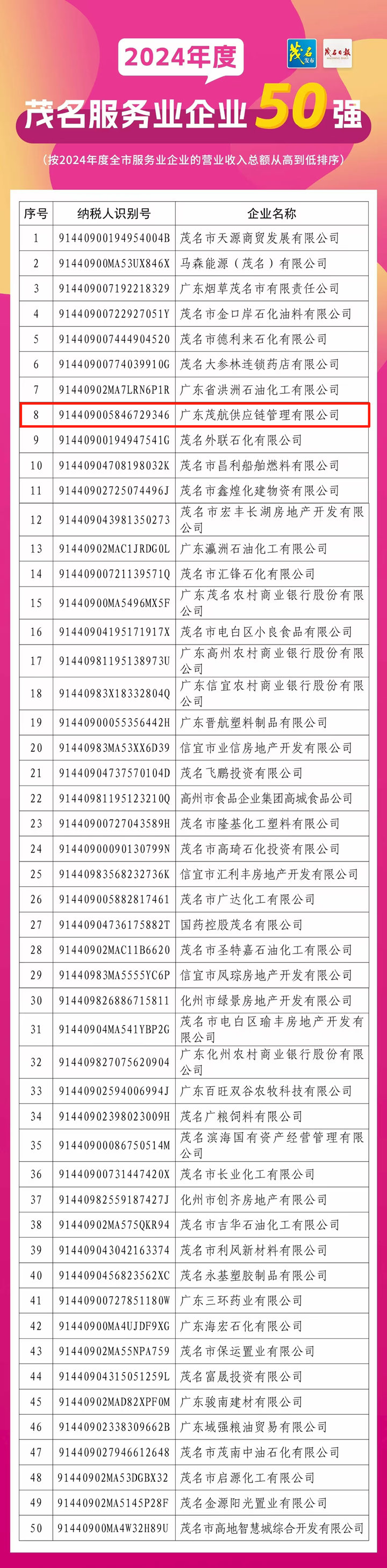 根據(jù)茂名市企業(yè)聯(lián)合會于2025年7月15日發(fā)布的通報,集團下屬茂航供應(yīng)鏈公司以優(yōu)異的業(yè)績表現(xiàn)位列茂名企業(yè)100強第23位,較2023年第37位躍升14名,并首次躋身茂名服務(wù)業(yè)企業(yè)50強第8位。此次雙榜單的歷史性突破,標志著茂航供應(yīng)鏈公司從傳統(tǒng)供應(yīng)鏈貿(mào)易商向供應(yīng)鏈科技企業(yè)的轉(zhuǎn)型取得實質(zhì)性成果。