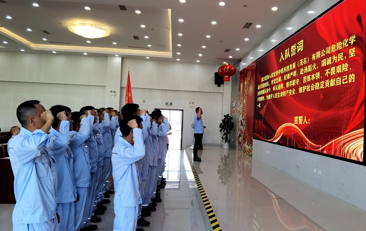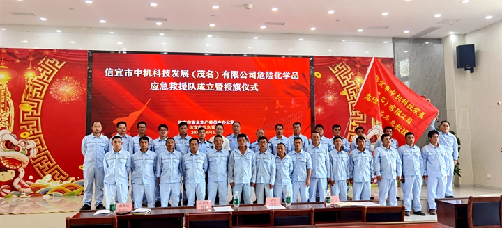 8月12日,集團(tuán)下屬企業(yè)中機(jī)科技發(fā)展(茂名)有限公司(以下簡稱“中機(jī)科技公司”)舉行危險化學(xué)品應(yīng)急救援隊成立暨授旗儀式。信宜市安全生產(chǎn)委員會、市應(yīng)急管理局相關(guān)領(lǐng)導(dǎo)出席儀式并為救援隊授旗。