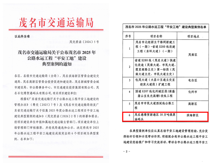 連續(xù)三年!茂名港博賀新港區(qū)30萬(wàn)噸級(jí)原油碼頭工程再度榮獲茂名市公路水運(yùn)工程“平安工地”建設(shè)典型項(xiàng)目